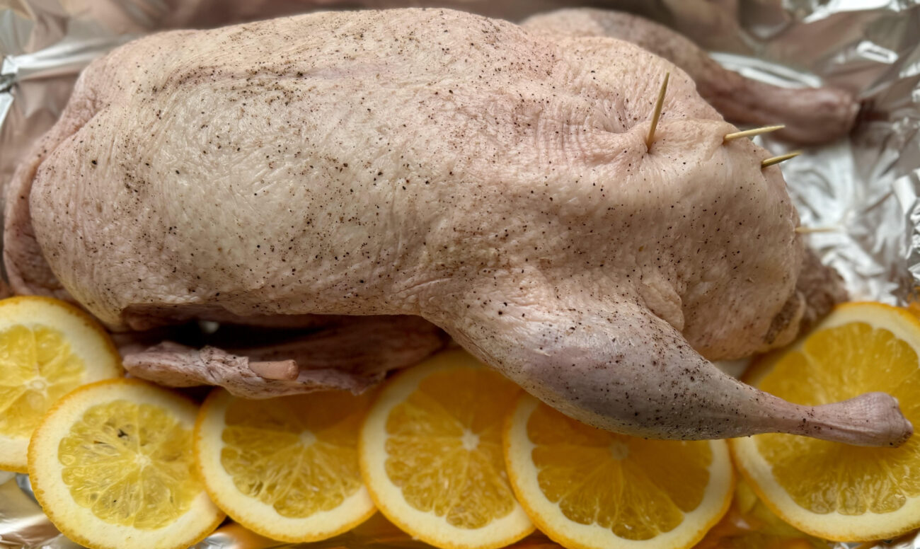 2. Take the duck out of the refrigerator, stuff it with chopped orange, and also place a cinnamon stick inside the duck. Secure the cut with toothpicks.
